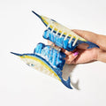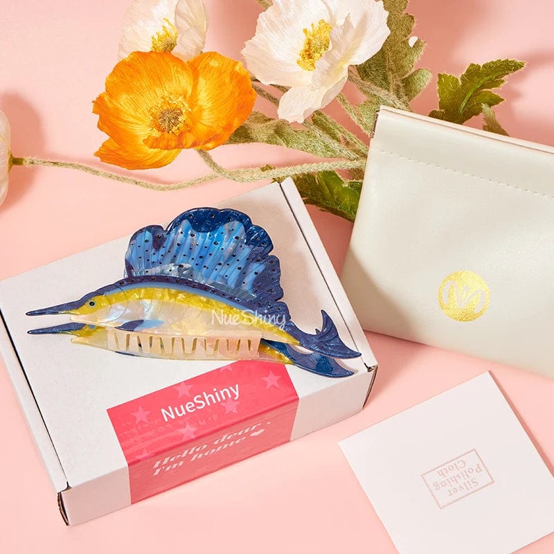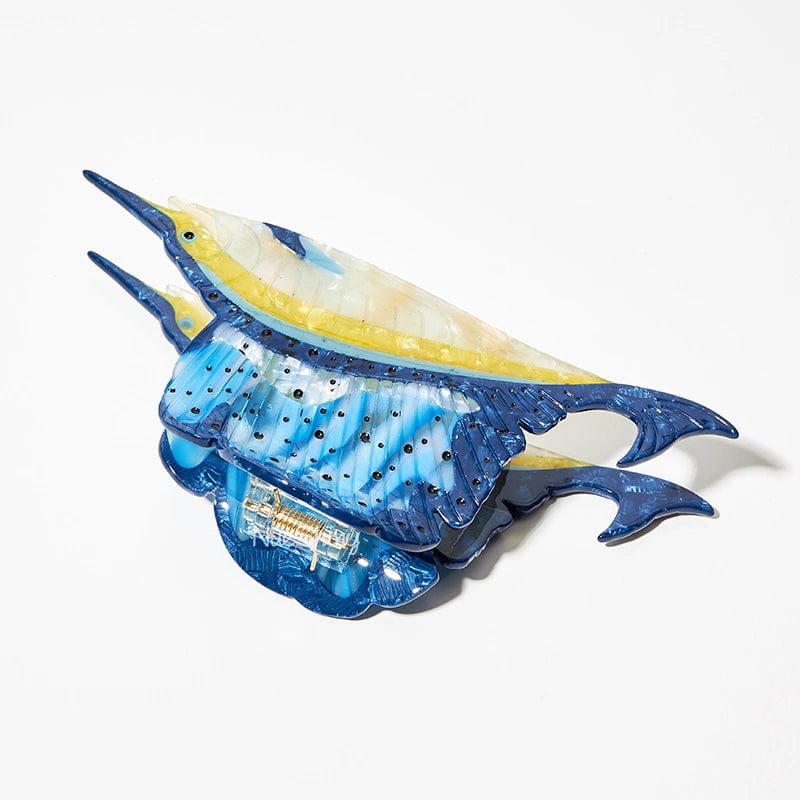 Inspired by the dynamic silhouette and pointed tip of the distinctive Atlantic sailfish and as their magnificent and enormous dorsal fins make them stand out among other marine creatures, this hair claw will sure to make every user to stand out like a sailfish, shining brightly in the crowd. While respecting their original features, we've paired vibrant azure and sapphire blue colors to add a touch of glamour.