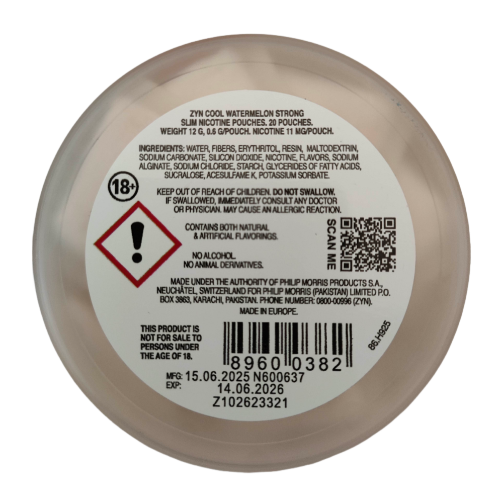 ZYN Cool Watermelon 11mg offers a refreshing and juicy watermelon flavor, complemented by a cooling mint finish. The sweet, fruity taste of ripe watermelon is perfectly balanced with a crisp, menthol-like chill, creating a refreshing and satisfying experience. Each slim, all-white pouch contains 11 mg of nicotine, delivering a strong and steady release for users who seek a more intense nicotine kick. The slim format ensures a discreet and comfortable fit under the lip, providing a clean, stain-free option for nicotine enjoyment. Crafted completely tobacco-free and made with high-quality plant-based materials, ZYN Cool Watermelon 11mg offers a modern, flavorful alternative for those looking for both fruitiness and a cooling sensation in their nicotine pouches. Specifications